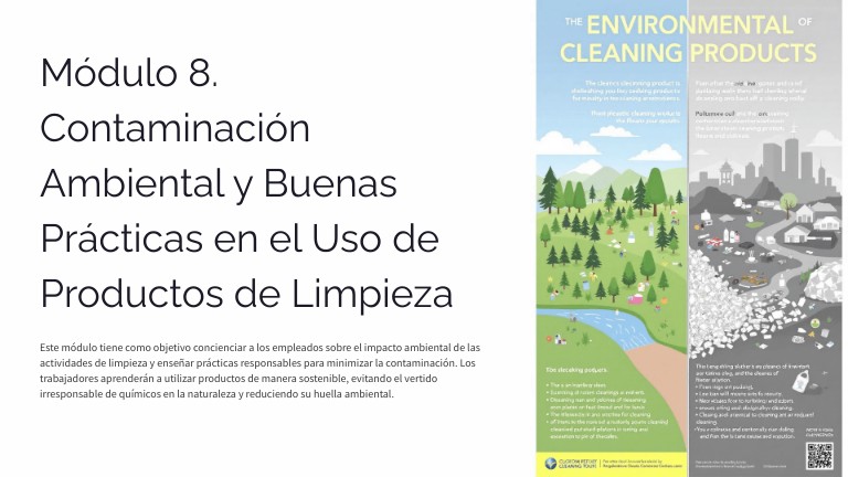Este módulo tiene como objetivo concienciar a los empleados sobre el impacto ambiental de las actividades de limpieza y enseñar prácticas responsables para minimizar la contaminación. Los trabajadores aprenderán a utilizar productos de manera sostenible, evitando el vertido irresponsable de químicos en la naturaleza y reduciendo su huella ambiental.