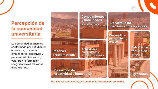 La comunidad académica conformada por estudiantes, egresados, docentes, empleadores, directivos y personal administrativo, valoraron la formación integral a través de varias dimensiones.
