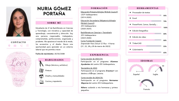 Estudiante de 2º de Bachillerato en Ciencias y Tecnología, con iniciativa y capacidad de aprendizaje, concentración y dirección. Soy una persona responsable, trabajadora, comprometida, perfeccionista, organizada y prudente. Me apasiona el mundo de la moda, los accesorios y el diseño. Busco una oportunidad para aprender en un entorno laboral que me permita crecer.