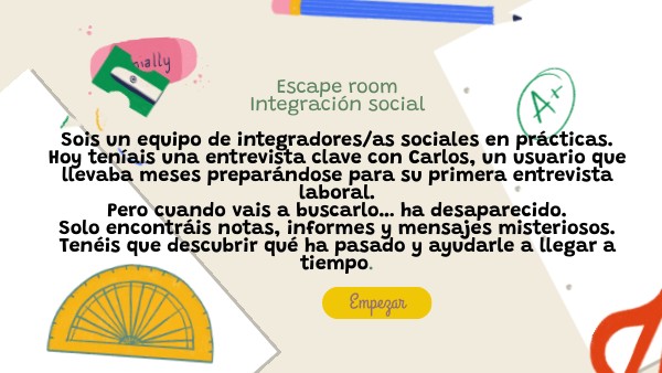 Escape room Integración social Sois un equipo de integradores/as sociales en prácticas. Hoy teníais una entrevista clave con Carlos, un usuario que llevaba meses preparándose para su primera entrevista laboral. Pero cuando vais a buscarlo… ha desaparecido. Solo encontráis notas, informes y mensajes misteriosos. Tenéis que descubrir qué ha pasado y ayudarle a llegar a tiempo.