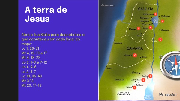 Abre a tua Bíblia para descobrires o que aconteceu em cada local do mapa: Lc 1, 26-31 Mt 4, 12-13 e 17 Mt 4, 18-22 Jo 2, 1-3 e 7-12 Jo 4, 4-6 Lc 2, 4-7 Lc 18, 35-43 Mt 3,13 Mt 20, 17-19