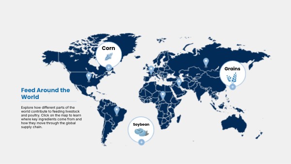 Each region plays a different role in supplying the energy, protein, and nutrients pigs need to grow. Click on the map to explore where key ingredients come from — and how global trade, climate, and farming practices shape swine feed production.