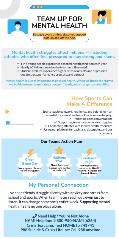 I’ve seen friends struggle silently with anxiety and stress from school and sports. When teammates reach out, even just to listen, it can change someone’s entire week. Supporting mental health means no one plays alone.