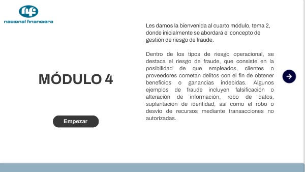 Correo electrónico: prevenciondelfraude@nafin.gob.mx Toda denuncia es confidencial, anónima y protegida, conforme a las políticas institucionales y lineamientos de la CNBV.Hemos culminado el módulo 4¡Continúa con tu aprendizaje!