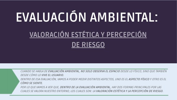 Cuando se habla de evaluación ambiental, no solo observa el espacio desde lo físico, sino que también desde cómo lo vive el usuario.Dentro de esa evaluación, vamos a poder medir distintos aspectos, uno es el aspecto físico y otro es el cómo se siente.Por lo que vamos a ver que, dentro de la evaluación ambiental, hay dos formas principales por las cuales se valora nuestro entorno, LOS cuales son: la valoración estética y la percepción de riesgo.