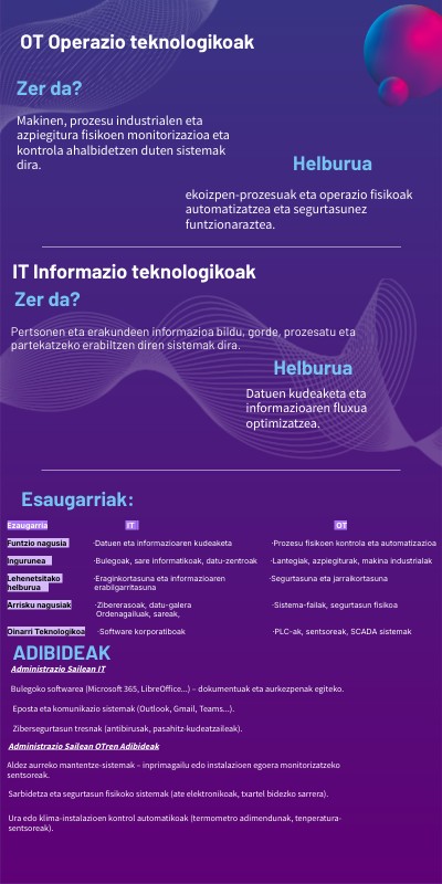 Ezaugarria IT OT Funtzio nagusia ·Datuen eta informazioaren kudeaketa ·Prozesu fisikoen kontrola eta automatizazioa Ingurunea ·Bulegoak, sare informatikoak, datu-zentroak ·Lantegiak, azpiegiturak, makina industrialak Lehenetsitako ·Eraginkortasuna eta informazioaren ·Segurtasuna eta jarraikortasuna helburua erabilgarritasuna Arrisku nagusiak ·Zibererasoak, datu-galera ·Sistema-failak, segurtasun fisikoa Ordenagailuak, sareak, Oinarri Teknologikoa ·Software korporatiboak ·PLC-ak, sentsoreak, SCADA sistemak