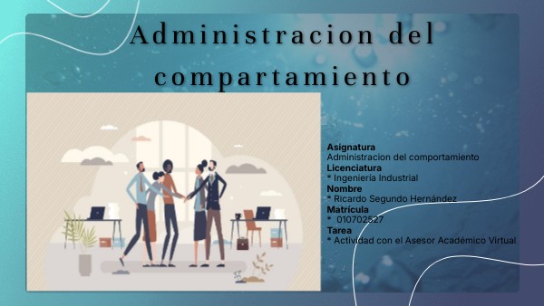 AsignaturaAdministracion del comportamientoLicenciatura* Ingeniería IndustrialNombre* Ricardo Segundo HernándezMatrícula* 010702527Tarea* Actividad con el Asesor Académico Virtual
