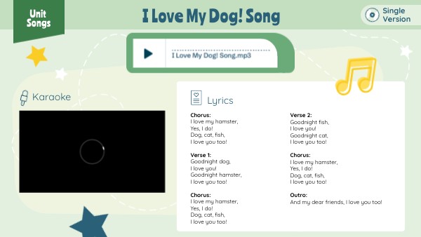 Chorus:I love my hamster, Yes, I do! Dog, cat, fish, I love you too! Verse 1:Goodnight dog, I love you! Goodnight hamster, I love you too! Chorus:I love my hamster, Yes, I do! Dog, cat, fish, I love you too!