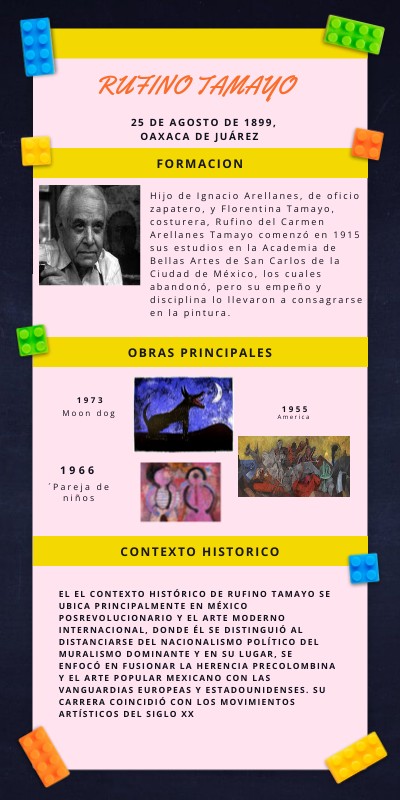 El El contexto histórico de Rufino Tamayo se ubica principalmente en México posrevolucionario y el arte moderno internacional, donde él se distinguió al distanciarse del nacionalismo político del muralismo dominante y en su lugar, se enfocó en fusionar la herencia precolombina y el arte popular mexicano con las vanguardias europeas y estadounidenses. Su carrera coincidió con los movimientos artísticos del siglo XX