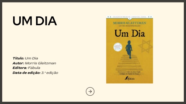 Título: Um Dia Autor: Morris Gleitzman Editora: Fábula Data de edição: 3.ª edição