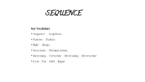 Key Vocabulary • Sequence = Sequência • Pattern = Padrão • Rule = Regra • Next term = Próximo termo • Increasing = Crescente / Decreasing = Decrescente • Even= Par / Odd =Ímpar