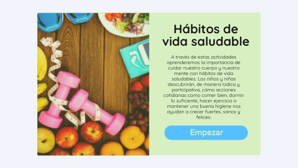 A través de estas actividades aprenderemos la importancia de cuidar nuestro cuerpo y nuestra mente con hábitos de vida saludables. Los niños y niñas descubrirán, de manera lúdica y participativa, cómo acciones cotidianas como comer bien, dormir lo suficiente, hacer ejercicio o mantener una buena higiene nos ayudan a crecer fuertes, sanos y felices.
