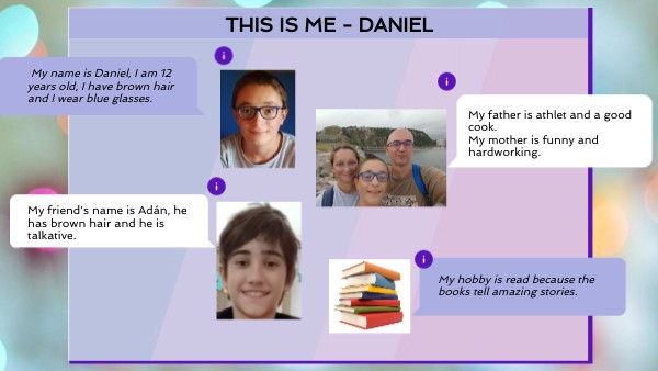 My name is Daniel, I am 12 years old, I have brown hair and I wear blue glasses.