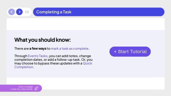 There are a few ways to mark a task as complete. Through Events Tasks, you can add notes, change completion dates, or add a follow-up task. Or, you may choose to bypass these updates with a Quick Completion.