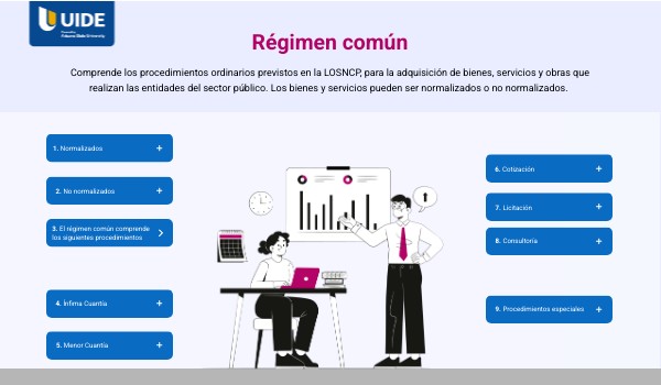 Comprende los procedimientos ordinarios previstos en la LOSNCP, para la adquisición de bienes, servicios y obras que realizan las entidades del sector público. Los bienes y servicios pueden ser normalizados o no normalizados.