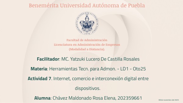 Facilitador: MC. Yatzuki Lucero De Castilla Rosales Materia: Herramientas Tecn. para Admon. - LD1 - Oto25 Actividad 7. Internet, comercio e interconexión digital entre dispositivos. Alumna: Chávez Maldonado Rosa Elena, 202359661