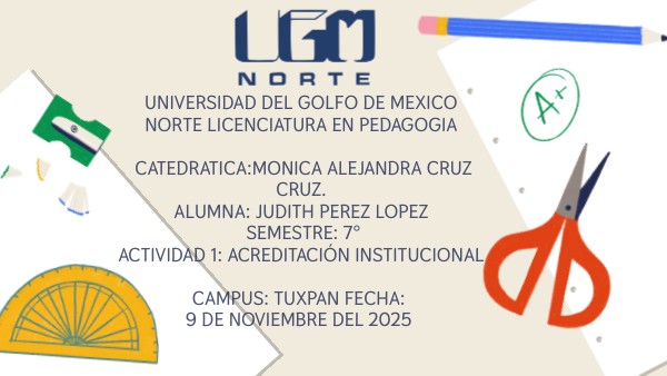 UNIVERSIDAD DEL GOLFO DE MEXICO NORTE LICENCIATURA EN PEDAGOGIA CATEDRATICA:MONICA ALEJANDRA CRUZ CRUZ. ALUMNA: JUDITH PEREZ LOPEZ SEMESTRE: 7° Actividad 1: Acreditación institucional CAMPUS: TUXPAN FECHA: 9 DE NOVIEMBRE DEL 2025