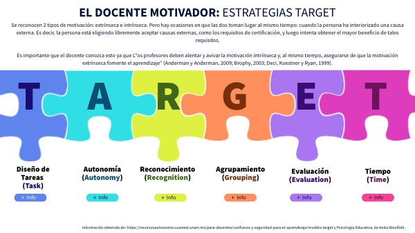 Información obtenida de: https://recursosautonomia.cuaieed.unam.mx/para-docentes/confianza-y-seguridad-para-el-aprendizaje/modelo-target y Psicología Educativa, de Anita Woolfolk.