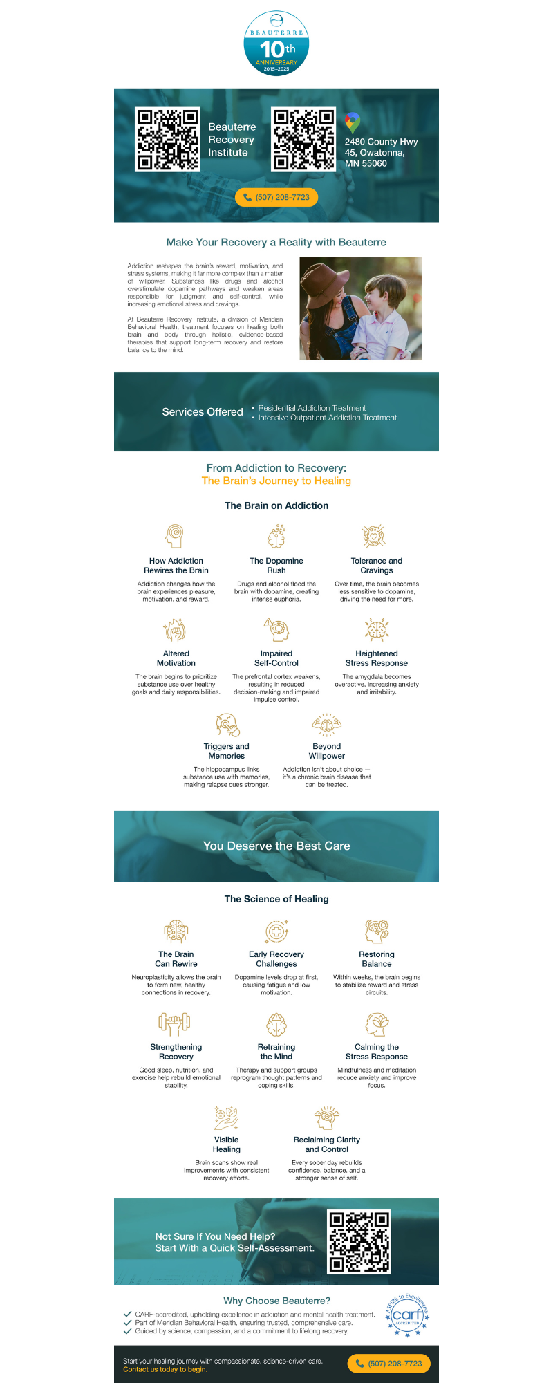 Beauterre Recovery Institute offers a welcoming environment where clients can pause, regroup, and build a recovery plan that fits real life. We take a whole-person approach, integrating therapy, skill-building, and wellness practices that support emotional stability and renewed purpose. Our clinicians collaborate closely with each individual to identify strengths, clarify goals, and create a care path that adapts over time. For those needing structured, round-the-clock care, residential addiction treatment provides a steady foundation with daily therapeutic engagement and supportive community. When it’s time to step down or when schedules require flexibility, our intensive outpatient addiction treatment keeps progress moving with targeted sessions and consistent accountability. Education for loved ones helps everyone understand recovery and become partners in change. Centered in Owatonna, Minnesota, our setting combines comfort with clinically informed care, so clients can focus on what matters most: sustainable habits, healthier relationships, and a clear plan for life beyond treatment. Our Services Residential addiction treatment intensive outpatient addiction treatment Contact Us Beauterre Recovery Institute 2480 County Hwy 45, Owatonna, MN 55060 (507) 208-7723