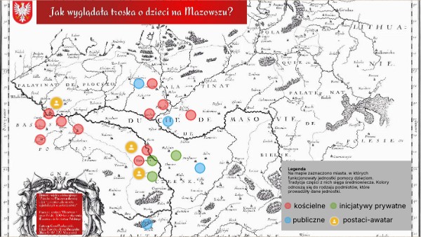LegendaNa mapie zaznaczono miasta. w których funkcjonowały jednostki pomocy dzieciom. Tradycja części z nich sięga średniowiecza. Kolory odnoszą się do rodzaju podmiotów, które prowadziły dane jednostki.