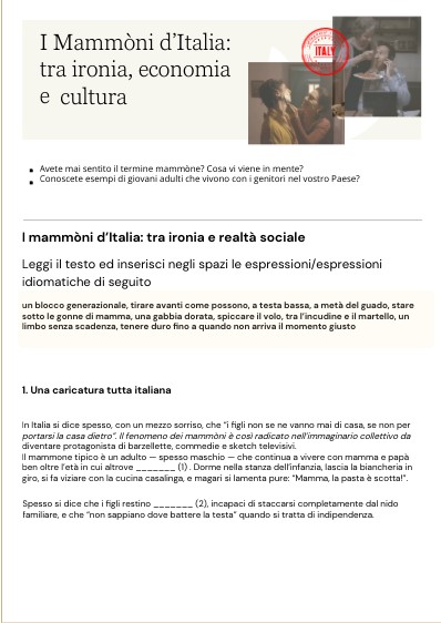 In Italia si dice spesso, con un mezzo sorriso, che “i figli non se ne vanno mai di casa, se non per portarsi la casa dietro”. Il fenomeno dei mammòni è così radicato nell’immaginario collettivo da diventare protagonista di barzellette, commedie e sketch televisivi.Il mammone tipico è un adulto — spesso maschio — che continua a vivere con mamma e papà ben oltre l’età in cui altrove _______ (1) . Dorme nella stanza dell’infanzia, lascia la biancheria in giro, si fa viziare con la cucina casalinga, e magari si lamenta pure: “Mamma, la pasta è scotta!”.