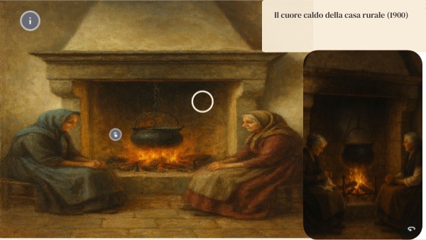 Due donne anziane, vestite con abiti umili, siedono accanto al fuoco. Una cuce con gesti lenti e precisi, l’altra contempla le fiamme con uno sguardo sereno. I loro volti, segnati dal tempo, riflettono la luce calda del fuoco, raccontando storie di fatica, resilienza e quotidianità.