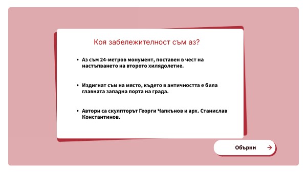 - Аз съм паметник-мемориал на българските герои, участвали в Руско-турската освободителна война.