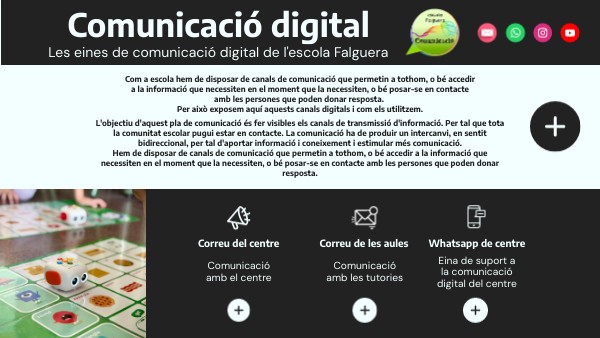 Tot centre educatiu ha de disposar d’uns canals d’informació i comunicació que facilitin la relació amb les famílies i afavoreixin la corresponsabilitat educativa. Han de tenir un caràcter bidireccional que permeti la comunicació directa entre l’escola i les famílies. És bo que les famílies sàpiguen què fem i per què, i donar l’oportunitat de fer arribar al centre les seves expectatives i opinions. Això contribuirà a la millora del funcionament del centre educatiu.Algunes de les eines i mitjans que faciliten aquesta comunicació entre escola i famílies són tecnològiques. Per això us deixem aquest aquí el pla de comunicació digital de l'Escola Falguera.