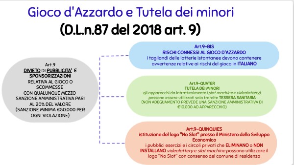 Art.9-QUATER TUTELA DEI MINORI gli apparecchi da intrattenimento (slot machine e videolottery) possono essere utilizzati solo tramite TESSERA SANITARIA (NON ADEGUAMENTO PREVEDE UNA SANZIONE AMMINISTRATIVA DI €10.000 AD APPARECCHIO)