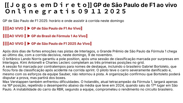 GP de São Paulo de F1 2025: horário e onde assistir à corrida neste domingo ►➤➤AO VIVO ☛ ▶️ GP de São Paulo de F1 Ao Vivo☚ ►➤➤AO VIVO ☛ ▶ GP do Brasil de Fórmula 1 Ao Vivo☚ ►➤➤AO VIVO ☛ ▶️ GP de São Paulo de F1 2025 Ao Vivo☚ Após dois dias de fortes emoções nas pistas de Interlagos, o Grande Prêmio de São Paulo da Fórmula 1 chega ao último dia, com a corrida decisiva, neste domingo, 9 de novembro. O britânico Lando Norris garantiu a pole position, após uma sessão de classificação marcada por surpresas em Interlagos. Kimi Antonelli e Charles Leclerc completam as três primeiras posições no grid. A sessão foi marcada por contratempos para nomes de destaque, incluindo o brasileiro Gabriel Bortoleto, que ficou fora da classificação após acidente na corrida sprint. O piloto teve o carro severamente danificado e, mesmo com os esforços da equipe Sauber, não retornou à pista. A organização confirmou que Bortoleto poderá disputar a prova, mas partirá dos boxes. Max Verstappen também enfrentou dificuldades. O holandês, atual tetracampeão da Fórmula 1, largará apenas na 16ª posição, repetindo o desempenho abaixo da média que teve em 2024, quando saiu do 17º lugar em São Paulo. A instabilidade do carro da RBR, segundo a equipe, comprometeu o rendimento no circuito brasileiro.