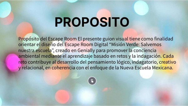 Propósito del Escape Room El presente guion visual tiene como finalidad orientar el diseño del Escape Room Digital “Misión Verde: Salvemos nuestra escuela”, creado en Genially para promover la conciencia ambiental mediante el aprendizaje basado en retos y la indagación. Cada reto contribuye al desarrollo del pensamiento lógico, indagatorio, creativo y relacional, en coherencia con el enfoque de la Nueva Escuela Mexicana.