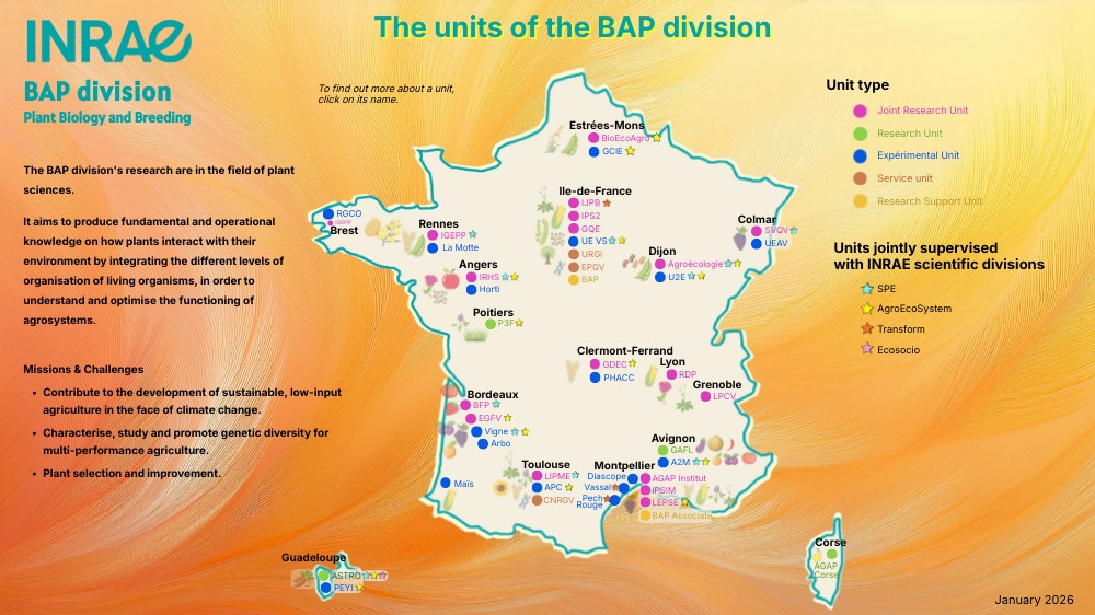 The BAP division's research are in the field of plant sciences. It aims to produce fundamental and operational knowledge on how plants interact with their environment by integrating the different levels of organisation of living organisms, in order to understand and optimise the functioning of agrosystems.