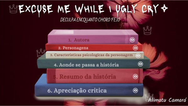 Título: Excuse me While I ugly cryAutora: Joya Goffney Nacionalidade: Norte-americana Genero literário: Romance juvenil/contemporaneo Editora: Haper Teen Ano de publicação: 2021 Número de páginas: Cerca de 365 pags Idioma original: Ingles Publico-alvo: Jovens adolescentes Temas principais: Autoaceitação, confiança, amizade, perdão e identidade.