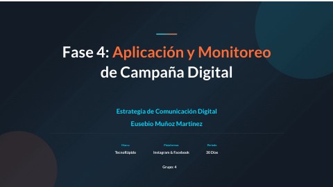🎓 Fase 4 Completada: Aplicación y monitoreo de campaña digital con éxito. TecnoRápido está posicionada para alcanzar sus KPIs (+30% seguidores Instagram, +20% consultas Facebook) mediante estrategia integral, basada en datos y orientada a resultados.
