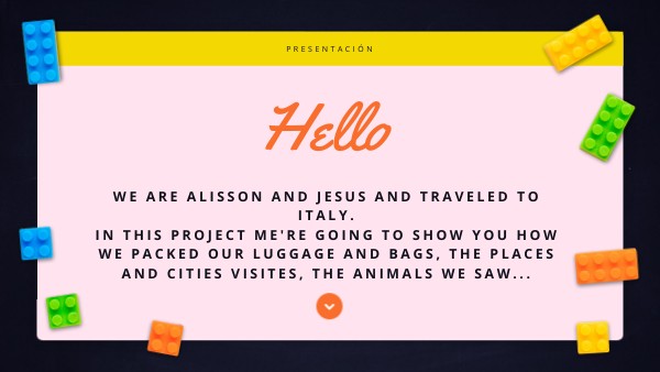 we are alisson and jesus and traveled to italy.In this project me're going to show you how we packed our luggage and bags, the places and cities visites, the animals we saw...