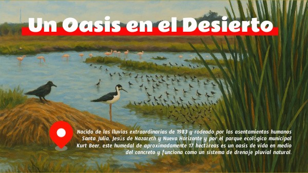 Nacido de las lluvias extraordinarias de 1983 y rodeado por los asentamientos humanos Santa Julia, Jesús de Nazareth y Nuevo Horizonte y por el parque ecológico municipal Kurt Beer, este humedal de aproximadamente 17 hectáreas es un oasis de vida en medio del concreto y funciona como un sistema de drenaje pluvial natural.