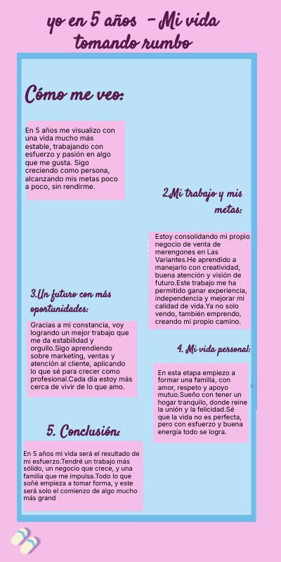 En 5 años mi vida será el resultado de mi esfuerzo.Tendré un trabajo más sólido, un negocio que crece, y una familia que me impulsa.Todo lo que soñé empieza a tomar forma, y este será solo el comienzo de algo mucho más grand