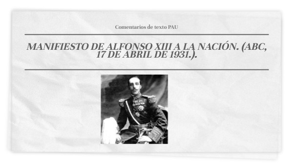 - Su autor es el Rey Alfonso XIII, que reinó en España entre 1902 y 1931. Es un texto público, dirigido a toda la nación, y firmado por el Rey el 13 de abril de 1931, y es una fuente primaria.