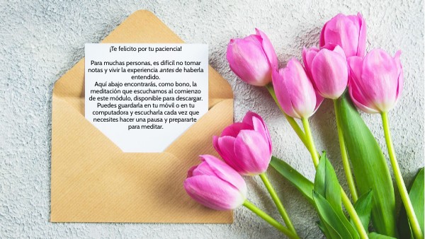 ¡Te felicito por tu paciencia! Para muchas personas, es difícil no tomar notas y vivir la experiencia antes de haberla entendido. Aquí abajo encontrarás, como bono, la meditación que escuchamos al comienzo de este módulo, disponible para descargar. Puedes guardarla en tu móvil o en tu computadora y escucharla cada vez que necesites hacer una pausa y prepararte para meditar.