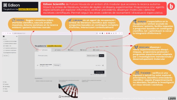 Edison Scientific de Future House és un entorn d'IA modular que accelera la recerca automa- titzant la síntesi de literatura, l'anàlisi de dades i el disseny experimental. Proporciona cinc agents especialitzats per explorar informació, verificar precedents, dissenyar molècules i detectar escletxes científiques. Permet seguir les seves cadenes de raonament i d'avaluació especulativa.