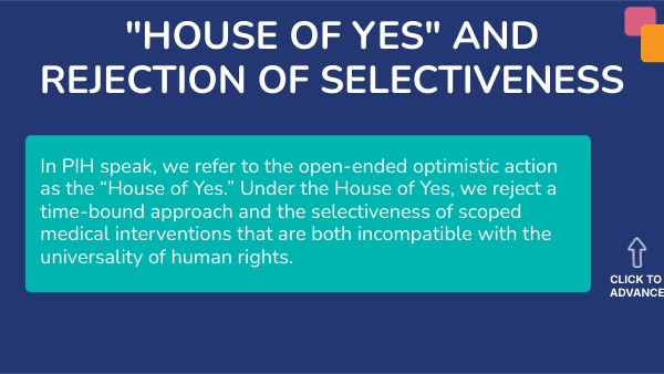 In PIH speak, we refer to the open-ended optimistic action as the “House of Yes.” Under the House of Yes, we reject a time-bound approach and the selectiveness of scoped medical interventions that are both incompatible with the universality of human rights.
