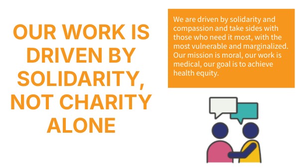 We are driven by solidarity and compassion and take sides with those who need it most, with themost vulnerable and marginalized. Our mission is moral, our work is medical, our goal is to achieve health equity.