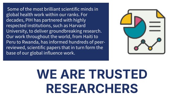 Some of the most brilliant scientific minds in global health work within our ranks. For decades, PIH has partnered with highly respected institutions, such as Harvard University, to deliver groundbreaking research. Our work throughout the world, from Haiti to Peru to Rwanda, has informed hundreds of peer-reviewed, scientific papers that in turn form the base of our global influence work.