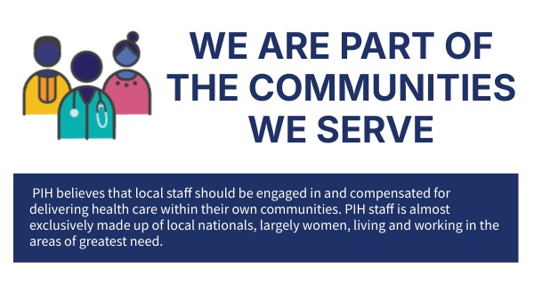 PIH believes that local staff should be engaged in and compensated for delivering health care within their own communities. PIH staff is almost exclusively made up of local nationals, largely women, living and working in the areas of greatest need.