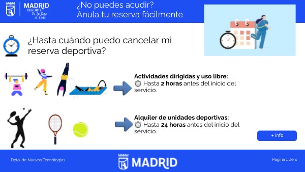 Si reservas sin coste (por ser titular del Abono Deporte Madrid o pertenecer a colectivos con bonificación), debes anular la actividad si no vas a acudir. De lo contrario, se aplicará la siguiente medida: Suspensión de la reserva anticipada durante 48 horas. No podrás reservar con antelación: Pistas de tenis 🎾y pádel🏓 Actividades dirigidas abiertas Uso libre: piscina cubierta🏊, sala multitrabajo💪, sauna y pistas de atletismo 🏃 Durante ese tiempo, solo podrás reservar 2 horas antes del inicio, siempre que haya disponibilidad.