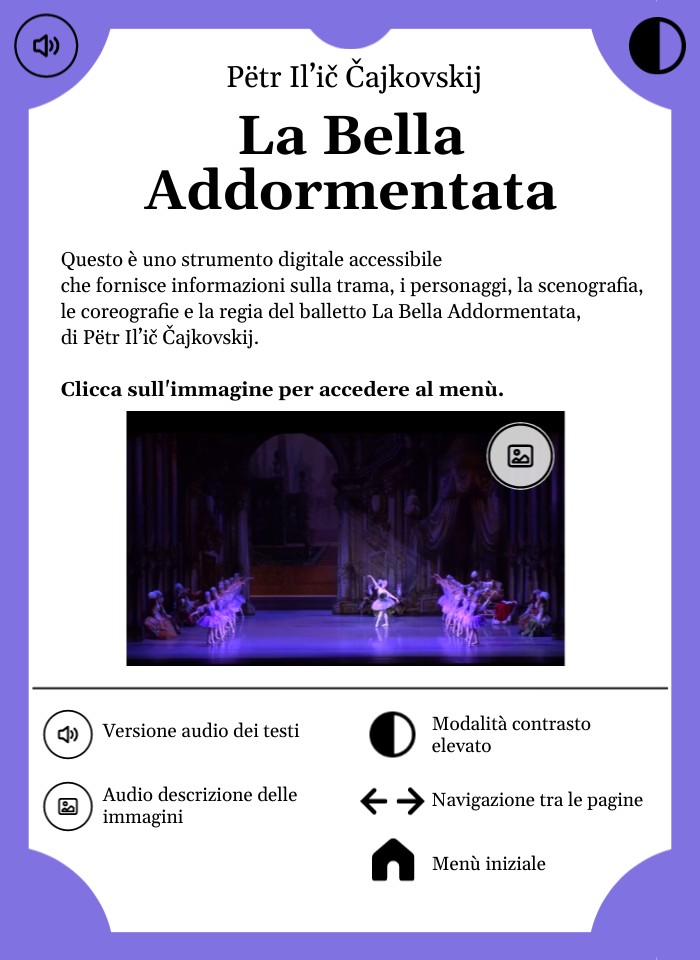 Questo è uno strumento digitale accessibile che fornisce informazioni sulla trama, i personaggi, la scenografia, le coreografie e la regia del balletto La Bella Addormentata, di Pëtr Il’ič Čajkovskij. Clicca sull'immagine per accedere al menù.