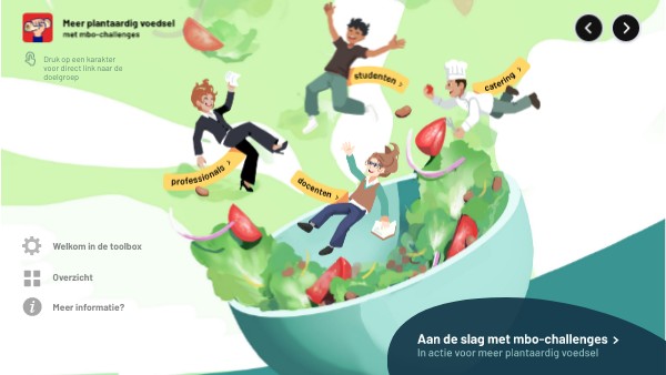 Startpagina. Voor docenten: Deze toolbox is voor alle docenten die op zoek zijn naar uitdagende lessen/programma's voor beroepsvitaliteit of plantaardig voedsel. Hier vind je het stappenplan voor het organiseren van een challenge, een keuzemenu om een challenge te kiezen, alsook de details van 9 verschillende plantaardige challenges. Voor studenten: Hoe naar meer plantaardig eten? Hier vind je inspiratie over plantaardige Foodstapjes en inspiratie en tips om hier alvast mee aan de gang te gaan. Voor catering: Hier vind je een white paper over wat de mbo-student denkt, vindt en doet met betrekking tot plantaardig voedsel alsook de ideeën en interventies die de mbo-studenten hebben bedacht voor de challenges. Voor professionals: Hier vind je informatie over de samenwerking in het onderzoek tussen hbo-mbo, een white paper over wat de mbo-student denkt, vindt en doet met betrekking tot plantaardig voedsel alsook de ideeën en interventies die de mbo-studenten hebben bedacht voor de challenges. Ook de 9 mbo-challenges komen aan bod. Voor iedereen: hier vind je antwoorden op FAQ's, en meer informatie (links, publicaties en over project MAP).