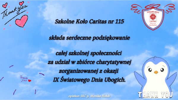 całej szkolnej społeczności za udział w zbiórce charytatywnej zorganizowanej z okazji IX Światowego Dnia Ubogich.
