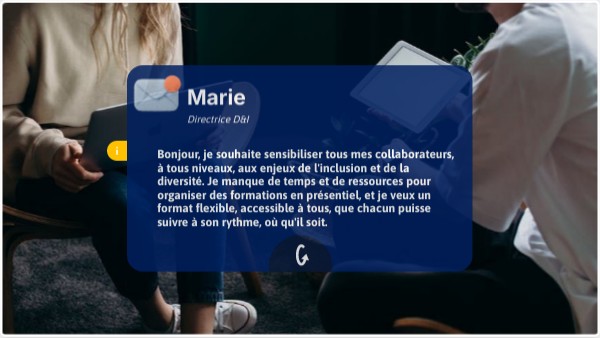 Bonjour Arnaud,Nous pourrions vous proposer des vidéos en motion design, l'une sur les stéréotypes et l'une sur la définition de l'inclusion et de la diversité. Nous les avons conçues en 24 langues. Elles durent 1.30 minute en moyenne et permettent de comprendre les concepts.