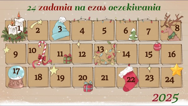 Dwadzieścia cztery zadania na czas oczekiwania, grudniowy czas radości świątecznej aktywności. Pierwszy grudnia nadszedł wreszcie wszyscy się radują zadań z kalendarza razem wyczekują. Dwadzieścia cztery zadania na czas oczekiwania, grudniowy czas radości świątecznej aktywności.